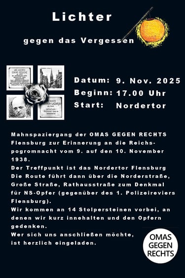 "Am Sonntag, den 09. November 2025 findet ein Mahn-Spaziergang unter dem Motto „Lichter gegen das Vergessen“ der OMAS GEGEN RECHTS Flensburg statt. Der Treffpunkt ist 17:00 Uhr am Nordertor.